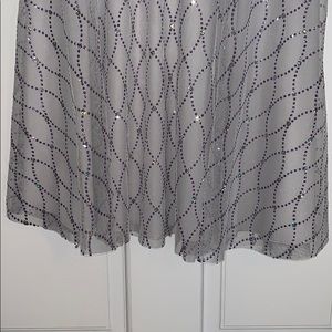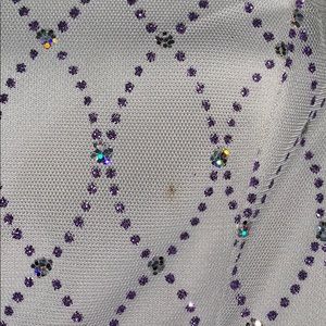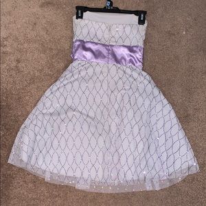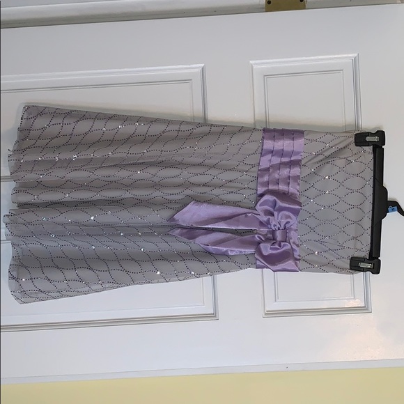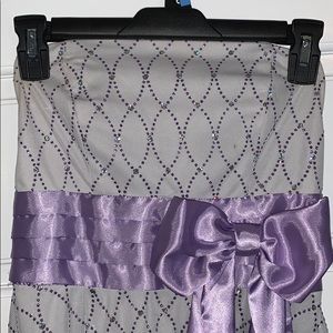 Strapless mini dress. Silver with purple and silver heeled detailing and purple bow. Small stain on the top as shown, other than that great condition. Size 3/4