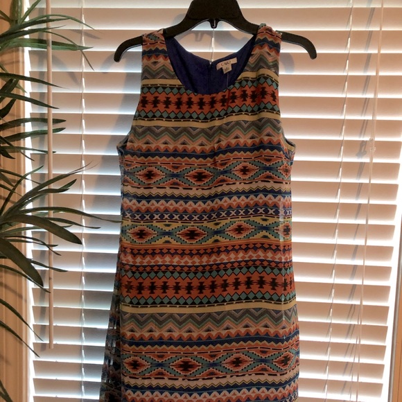 NWT. Cato sleeveless tank, a line dress. Has an Aztec print of royal blue, turquoise, rust, yellow, black and white. Fully lined polyester.