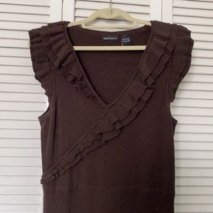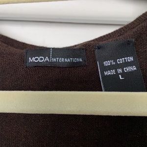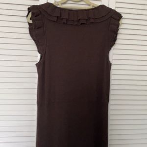 Moda International knit dress in dark brown. Ruffles adorn the front and shoulders. 100% cotton in size Large . Length is 42 inches from shoulder 25 inches from waist. Gently used and smoke free environment.