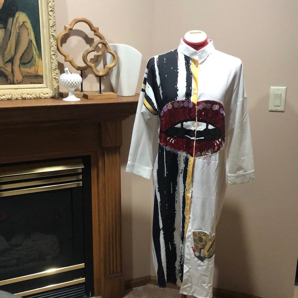 Great dress for a night out. Some damage to the large pieces around the mouth but not too noticeable. Looks like they were too close to a heat source.