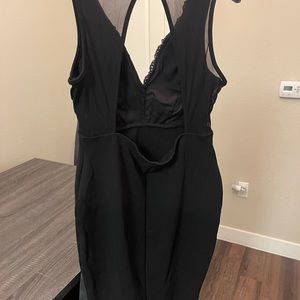 Black sleeveless sheer shoulder dress with flowered design on front breast area and sheer chiffon on back