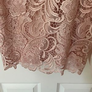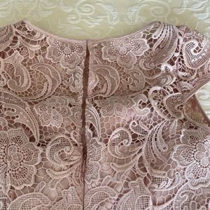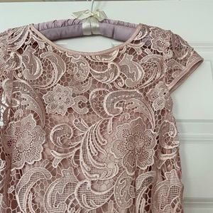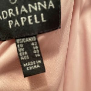 Beautiful Adrianna Arpell dress. Size 10. Runs small. I normally wear size 6-8 in a dress, sized up. Fit: waist beautiful satin tie ribbon (can be removed), hits at knee or slightly above depending on your height, rounded neckline with see through lace, back keyhole slit neckline, under slip same color as dress. Gorgeous satiny lace all over the dress with satin piping, scalloped hem. Beautiful dusty rose color. Good for weddings and special events. Dress is exquisite. Worn 1x.
