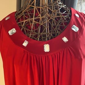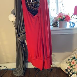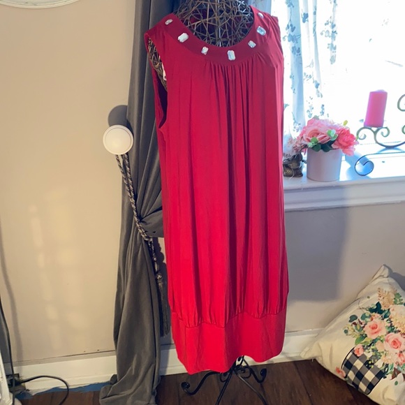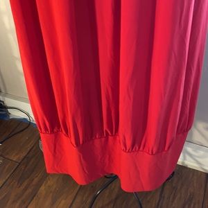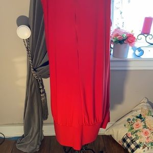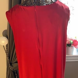 Pretty red dress stretchy material fully lined can we dressed up or down used maybe three times. No stains tears and is in excellent used condition. Thank you!