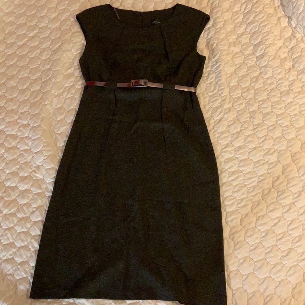 Gray sleeveless dress with chrome belt.