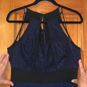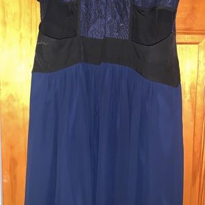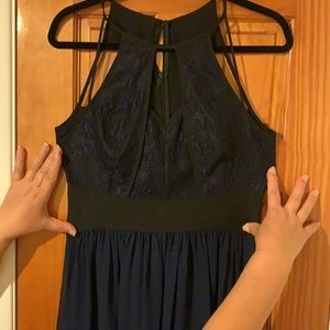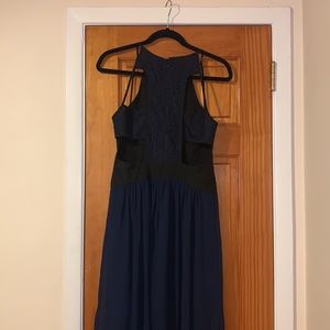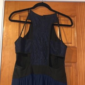 Long dress with cut out little damage on zipper worn 1x as casual bridesmaid dress. Great for fancy dinners, wedding or other events.