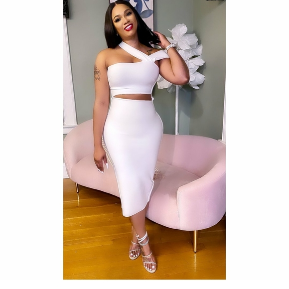 Sexy Asymmetrical Neck Cut Out Front bandage white dress. Zipper closure on the side.