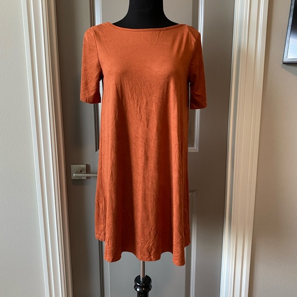Orange suede short sleeve dress with an open back