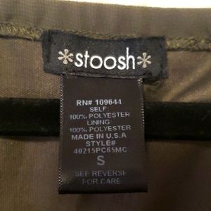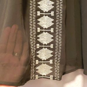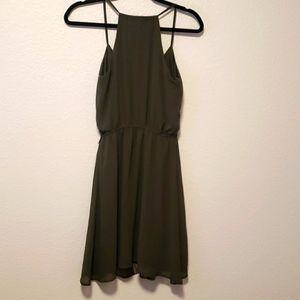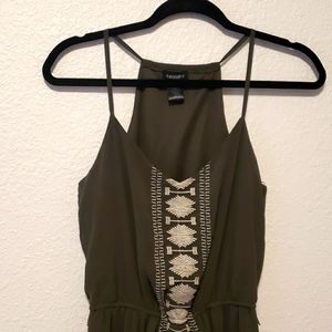 This army green dress has a cute design in cream embroidery that runs down the front. Cinched waistline with small loops on side if you would like to add a thin belt for style. This dress has a sheer overlay as pictured that is longer than the slip underneath. Fits like a small/ medium and length falls right above knee for average height. 100% polyester and made in the U.S.A.