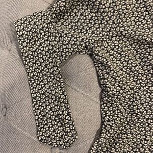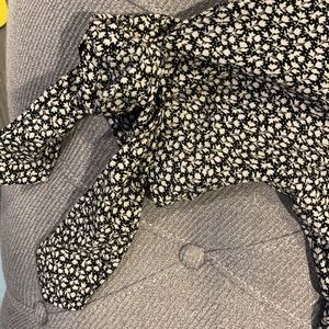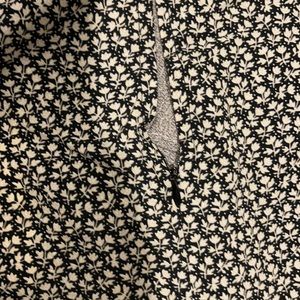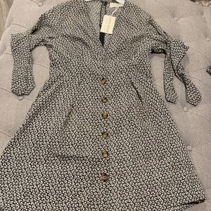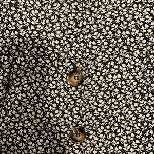 Black & white floral print dress with brown buttons from the waist down. This is lightweight but NOT see through. Slightly lower V style in the chest area. The sleeves are very sweet appearing as they tie in a knot or bow. This is true to size. If you have a larger chest area you may want to size up or plan to wear something underneath so it’s less revealing. The back has two buttons at the top and then a clasp with a zipper running down the back. I love this dress, I got engaged wearing it:) 100% polyester. These are all brand new. All but one are still in the plastic bag it was purchased in!