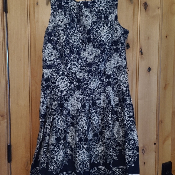 Signature by Robbie Bee, size 14. Gently used. No longer has the ribbon belt that came with it. Originally bought it at Dillards. 97% cotton 3% spandex. Fitted at the waist,, very comfortable.. Machine washable.