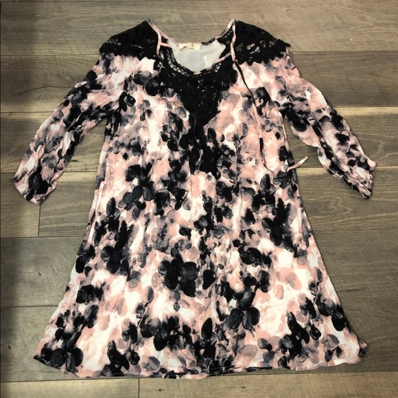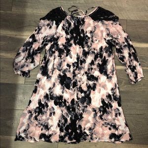 Nice dress that is lined and 3/4 sleeves with elastic and lace around neck and on shoulders with tie in front. Size small.