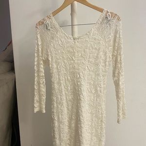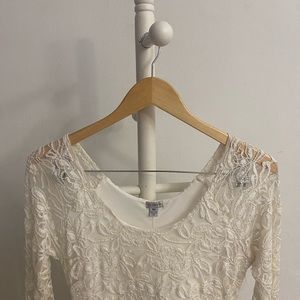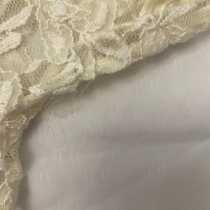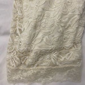 Dress, off white lace with slip. Can be worn off the shoulders. A few loose strings but overall good condition!