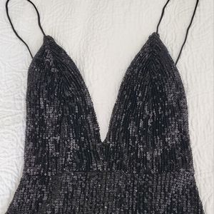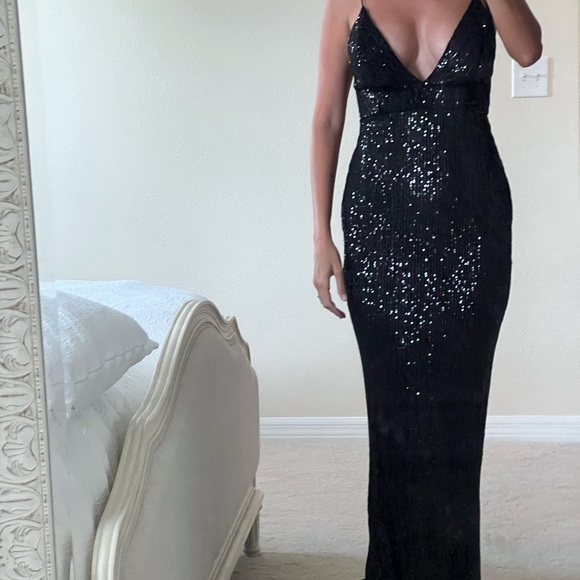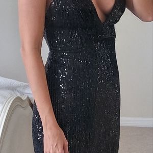 black sequined gown. deep v neckline and low back. size small. long with a very small train in the back.