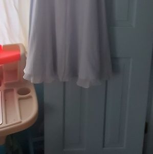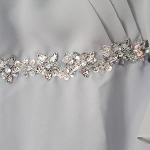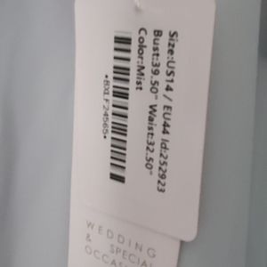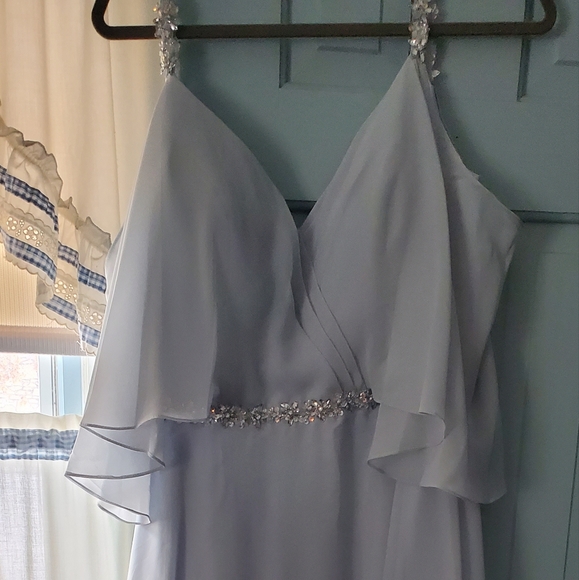 very flattering, beautiful special occasion dress. gorgeous rhinestone straps and embellished waist. tea- length. size 12/14. never worn in color Mist from JJ House.