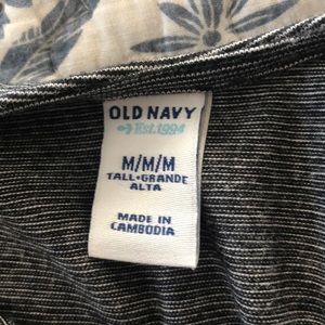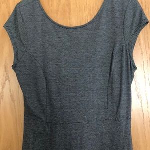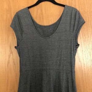 Tee shirt fit and flare dress with bodice seaming and lower back. Cap sleeves. 37” from shoulder. Black/white stripe