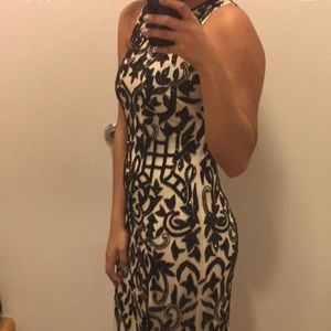 This stunning rhinestone detailed/beaded dress will look amazing in all of your memorable prom night photos. It is cream with black rhinestones all over the dress. It is a high neck line in the front and back with a zipper.