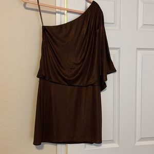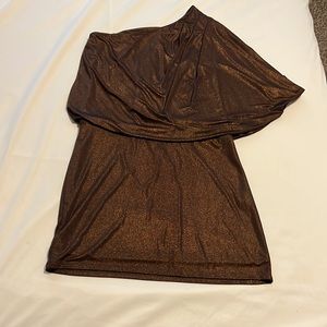 Copper off the shoulder dress. Says it’s a small but I’m a medium and it fits great. Hides my tummy