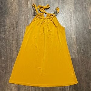 For sale is this nice dress, in a beautiful mustard yellow color. The item is gently loved, having been worn once. There is a mark/stain on the dress that should come out, see photos. I may spot clean it, if I do, photos will be updated. If the photos are not updated, and you purchase, the dress will come as is.