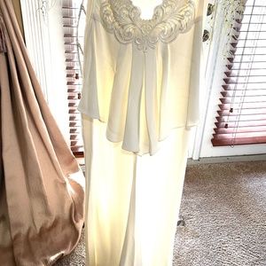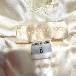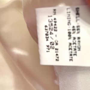 This dress was purchased for a prom, but has never been worn. This is a stunning dress made by a designer in the USA. The dress is aan egg shell color all lined inside with a silky material. The dress is size 8 not stretchable. The dress has been made from 55% rayon,45% Acetate and the lining is 100% AcetateThe dress has a sweat heart bust line all covered by the beutiful lace applique that goes up in the front and then it continues in the back to create a decorated back with the opening of the straps that end st esch side embelished by a sheer material like the ones used in vails. The back then drops more with a pleaded accent made from the same material that makes the body look curved and sharp. The dress has a zipper on the left side that can barely be seen. This dress can also be worn as a weeeding dress if desired. It is that beautiful.