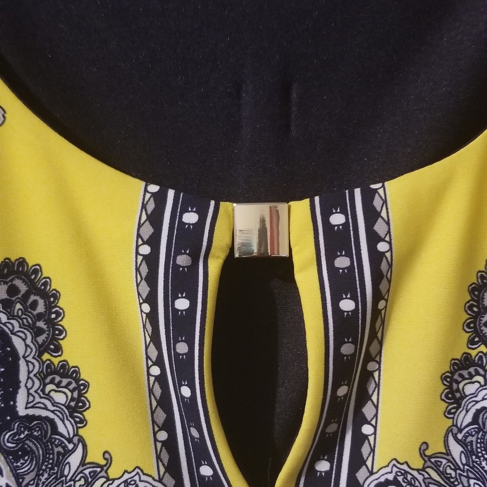Yellow and navy blue dress and some gray never worn. 96 Polyester 4% spandex.