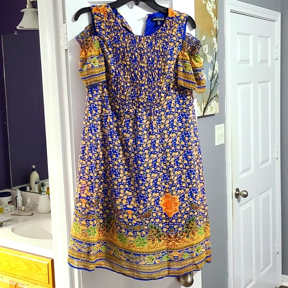 Gold & Blue pattern lined with bluecircle'neck dress with shirring on front chest area and cold-shoulder sleeves. Worn once
