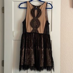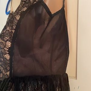 Worn a couple of times. Super cute. Lacey. Lined. Invisible back zipper. Lace portion 32" in length (measured from neck), lined portion is 29". Sides of dress are sheer.