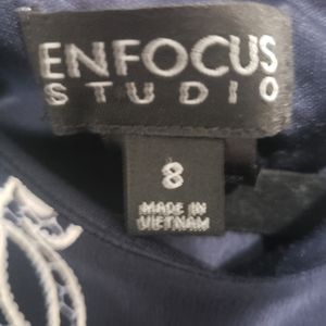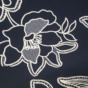 Navy with white rose pattern and red pen stripe on the sleeve. Knee length dress. Semi strech.