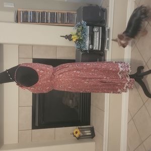 Burgundy summer dress with flowers and and elastic around the waist no sleeves spaghetti straps they straps with a single button in the back that's a neck Split on both sides (JEWELRY NOT INCLUDED)