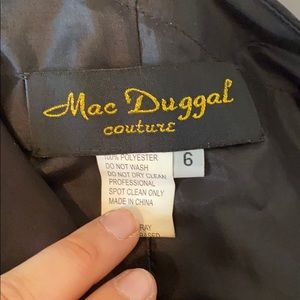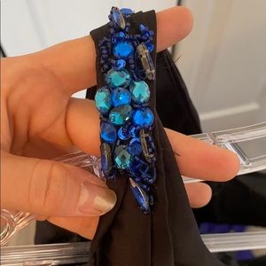 Black short dress with side cutout and long, blue/ purple side train. Has bra pads tacked in but easily could be removed