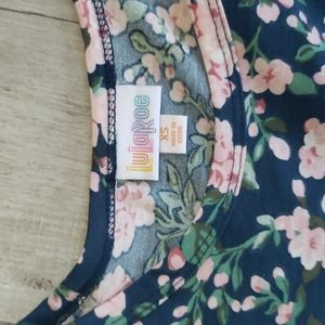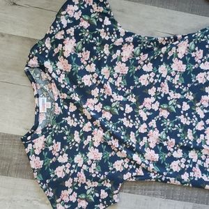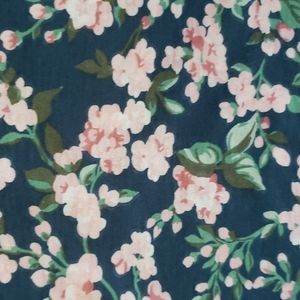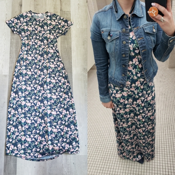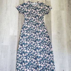 floor length dress. stretchy and comfy. floral design pink and green with a navy blue background. only one or few times.