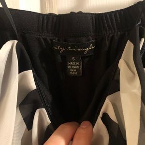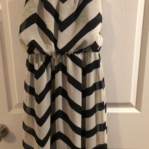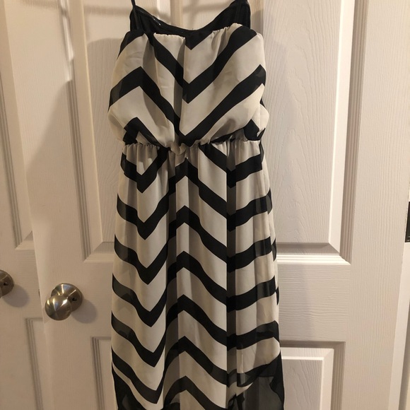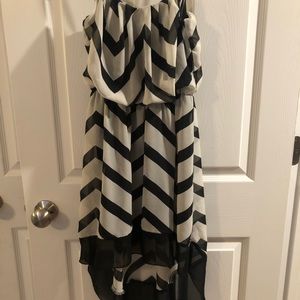 Strapless black and white dress, dress is short in the front and longer in the back.