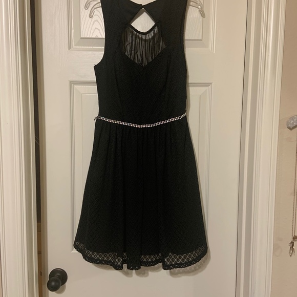 Jodi Kristopher little black dress. Size 7. Rhinestone trim at the waist. Illusion neckline with keyhole back. Fun and flirty.