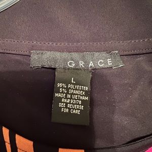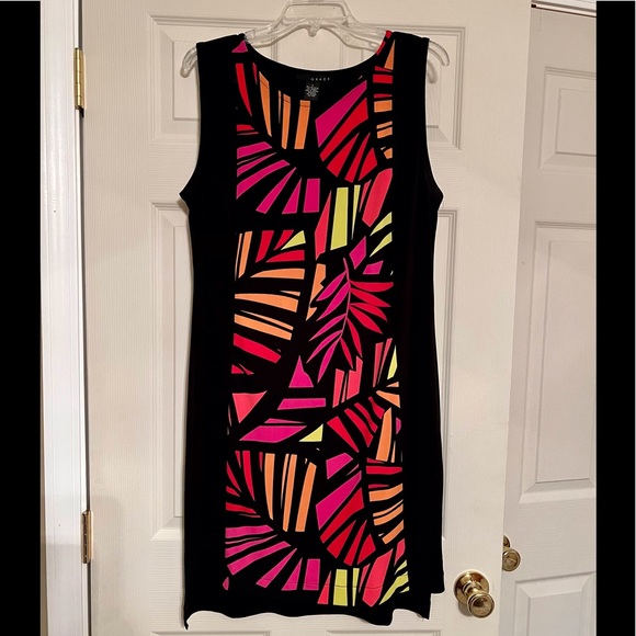 Dress with tropical pattern at front in pink, orange, and yellow colors.