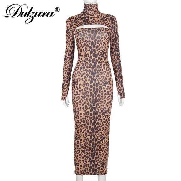 Leopard Long Sleeve Short Shirt Tube Midi Dress