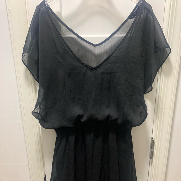 Black sheer dress with black slip under. I’m 5’7, hits just above my knees. Medium. Will fit size 10.