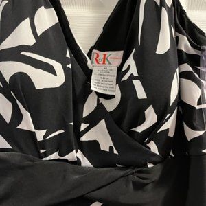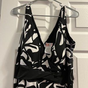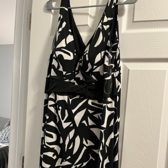 Stylish black and white dress. Hits a little below knee.