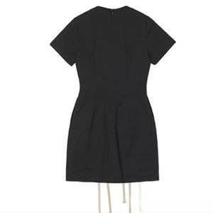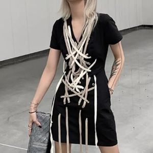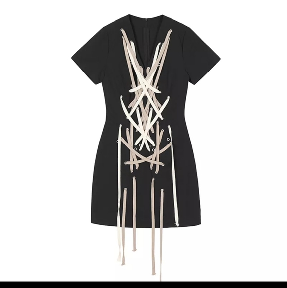 All Tied Up dress with criss cross shoe strings throughout with short sleeves and zippered back.