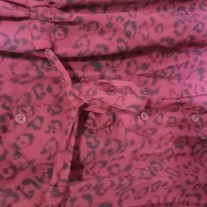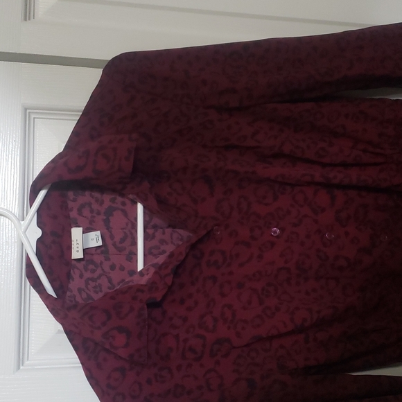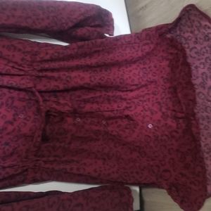 adorable burgundy, cheetah print dress. buttons down and toes in the middle. cute and comfy and also great for work!