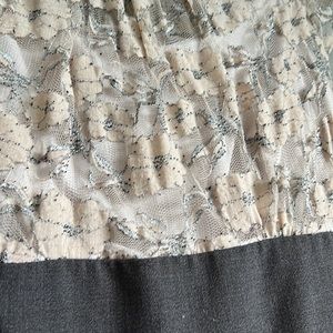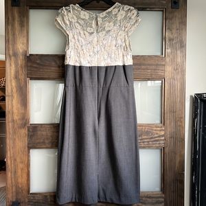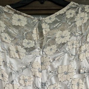 Beautiful dress for work with flower detailing at the top. Nylon, metallic and spandex. Buttons and zips in back.
