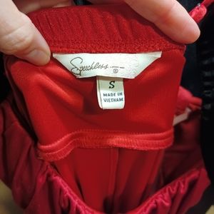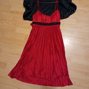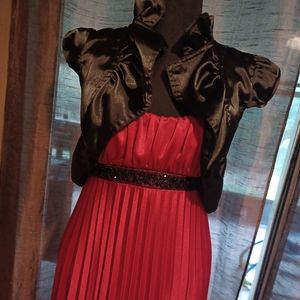 Red dinner dress, with black cover for shoulders, size small. 1 small sequence out of place on front. Ties in back. Good condition