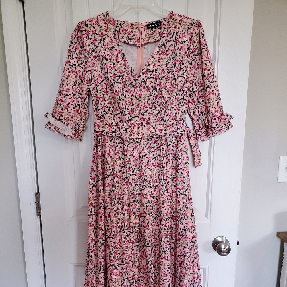 Shein brand pink dress with pink roses.