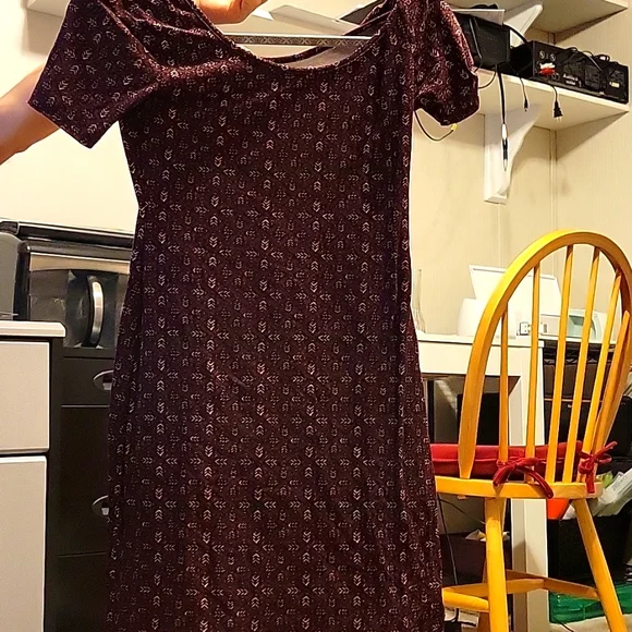 Short body on dress. Polyester cotton blend. more of a maroon color in person