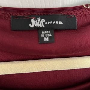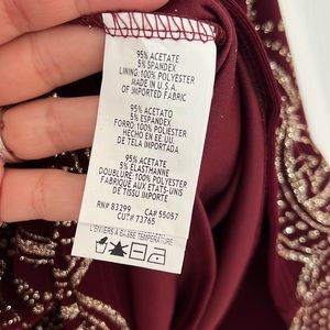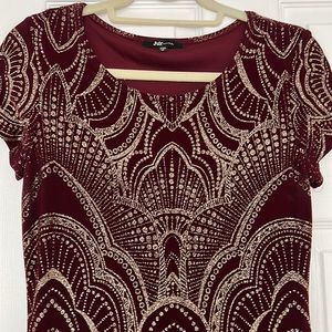 Short sleeve Burgundy with gold glitter design stretch dress. With attached Burgundy slip
