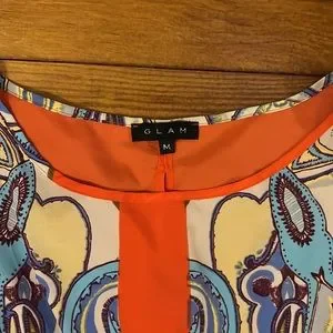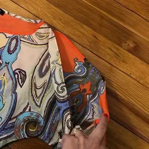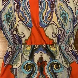 Orange and cream pattern dress. Cinched at the waist. Slits along the arms and slit in the upper back