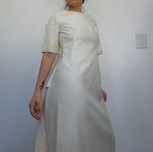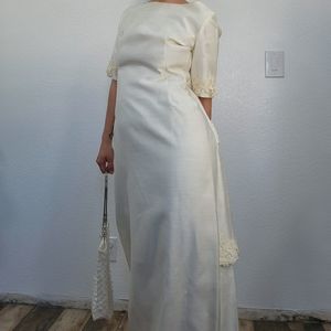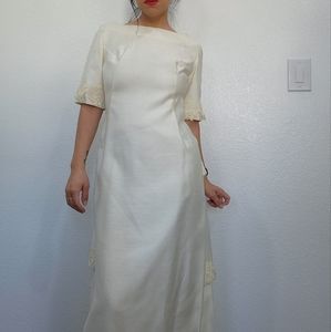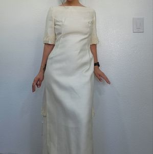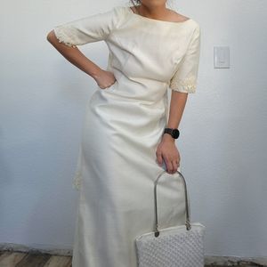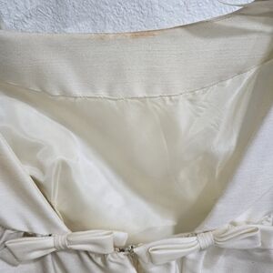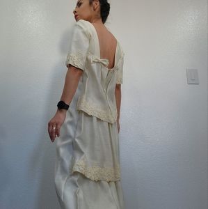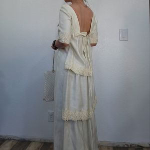 cream colored wedding dress with beautiful back , lace trimming, square neckline by Emma Domb
