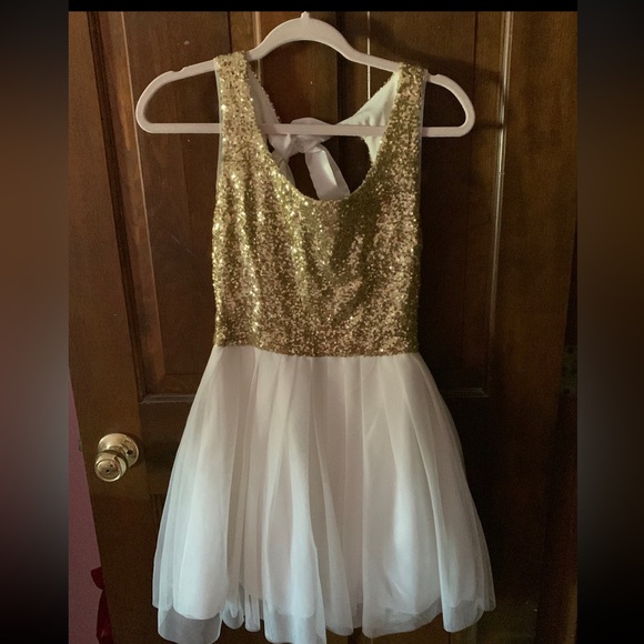 Has a gold sparkly bodice and a white tulle skirt. Only worn twice- in very good condition #homecoming #balletcore #formal