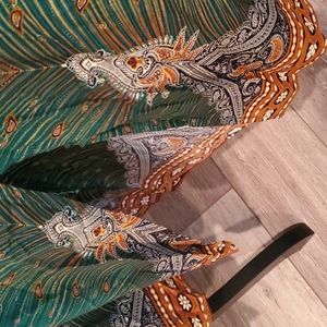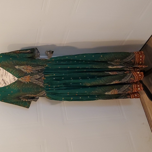 beautiful dark green, with Peacock like designs, full skirt, elastic waist side pockets, peek a boo slit bottom left, size 14/16 fits more like 14 thru chest