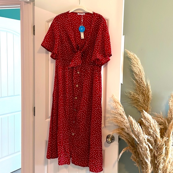 Cute red dress with buttons and tie in the chest. Tag says XL but fits more like a L