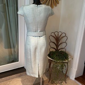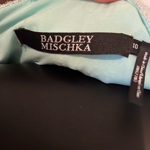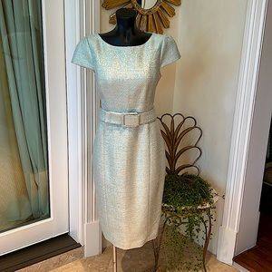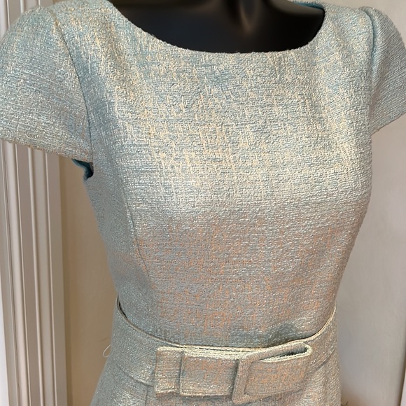 Beautiful tailored light tourqoise Badgley Mischka dress with metallic gold threading throughout.