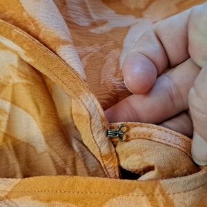 An orange dress with lots of ruffles. The top has a latch to help hold it together. The belt is attached. Short sleeves with ruffles. Smoke free home. Bundle and save.